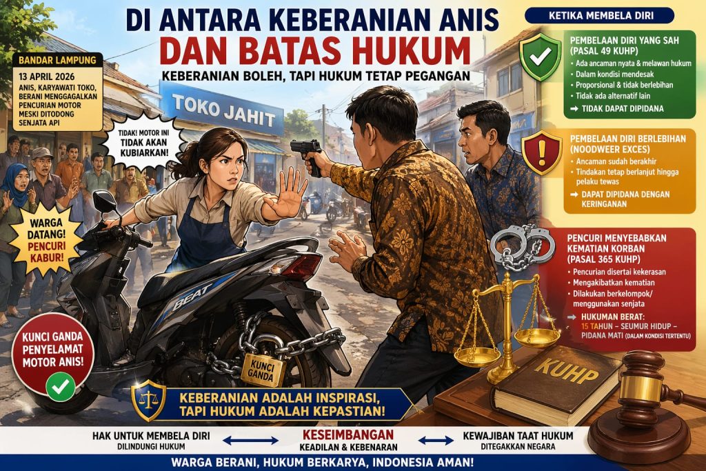 Peristiwa yang terjadi pada 13 April 2026 di kawasan Tanjung Karang Barat itu bukan sekedar cerita keberanian, tetapi juga membuka ruang diskursus penting di mana batas antara pembelaan diri dan pelanggaran hukum?