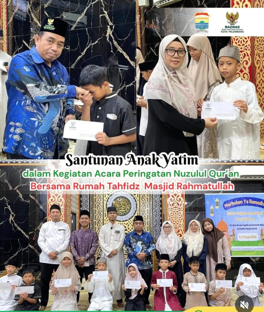 Clickinfo.co.id – Badan Amil Zakat Nasional (BAZNAS) Kota Palembang menyalurkan santunan kepada anak yatim dalam rangka peringatan Nuzulul Qur’an bersama Rumah Tahfidz Masjid Rahmatullah. Kegiatan ini menjadi bagian dari upaya menghadirkan keberkahan Ramadan sekaligus menumbuhkan kepedulian sosial di tengah masyarakat. Senin, 9 Maret 2026.